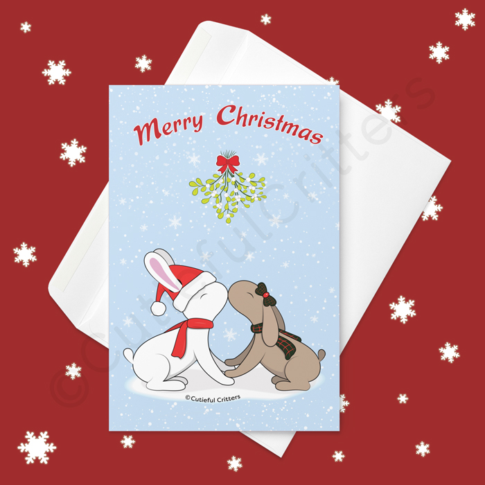 Bunnies are kissing under the mistletoe Greeting card